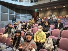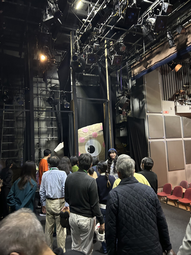 この後、劇場内に入れてもらい、バックステージツアーです。舞台の上に乗せていただき、恵比寿社会教育館で教えてもらったことを実際に確かめることができました。舞台下をのぞきこんだり、さわっちゃいけないホリゾントや黒幕、袖幕などを確認できました。上を見上げて照明類がどうなっているかを見ることもできました。舞台は思ったよりも広く感じましたが、袖が狭いために苦労も多いことがわかりました。
