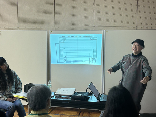 さて、講師は、今回の演出補佐を務めた女優で声優の雨蘭咲木子(うらんさきこ)さんと演出家青柳敦子さんのお二人です。作品のこと、舞台の構造、舞台美術のこと、そして裏話などを聞きました。