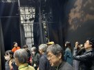 舞台装置をどのように作るのか?舞台美術家は舞台のミニチュア模型を作ります。それを見ながら関係者で議論して決めていくそうです。今回はその舞台のミニチュア模型(50分の1縮尺)を受講生ひとりひとりのぞかせてもらいました。腰をかがめてのぞき込むと、第一幕のゴミ山の舞台の様子がよくわかります。