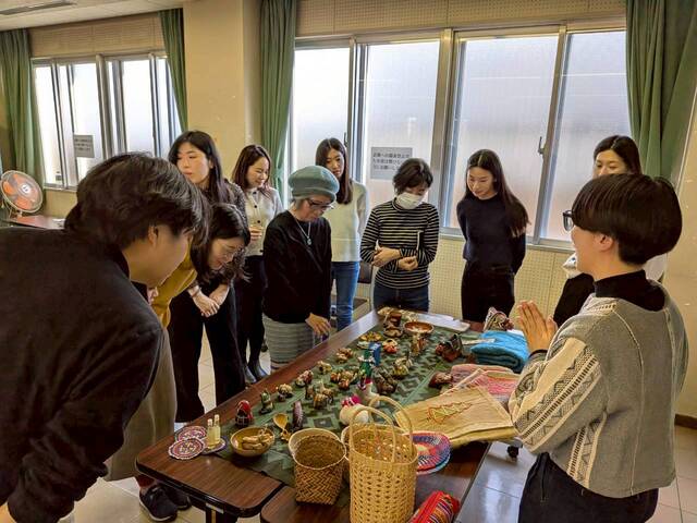 山本さんが現地で収集された工芸品を囲みながら、一つひとつの背景にある物語を伺いました。色鮮やかな工芸品は、森に生きる鳥や植物の色彩から影響を受けているといいます。先に学んだ「森が文化を育む」という話が、ここで具体的な形となって目の前に現れました。