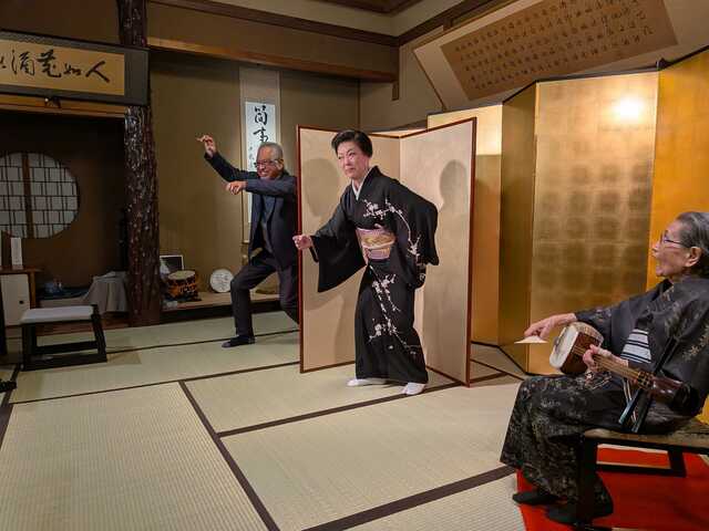 参加者のみなさんのテーブルに入り、場を盛り上げる軽妙なトーク、そして瓢屋 小糸姐さんの三味線、鼓に合わせて踊りと長唄。