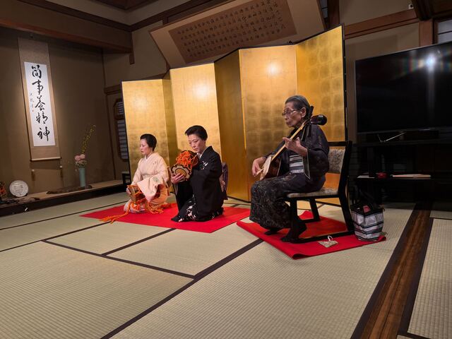 歴史を学んだ後は、いよいよ本番。芸者の瓢屋 小糸姐さん、喜利家 鈴子姐さんと三吉姐さんが登場すると、会場の空気は一変して華やぎます。「無礼講」とはいえ、そこには長年培われてきたプロの「もてなし」の技がありました。